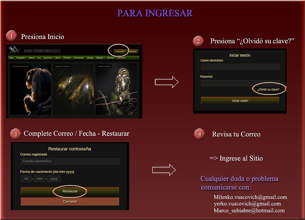 Si ya tienes cuenta en Foto naturaleza, debes generar una nueva contraseña siguiendo las instrucciones de la imagen.